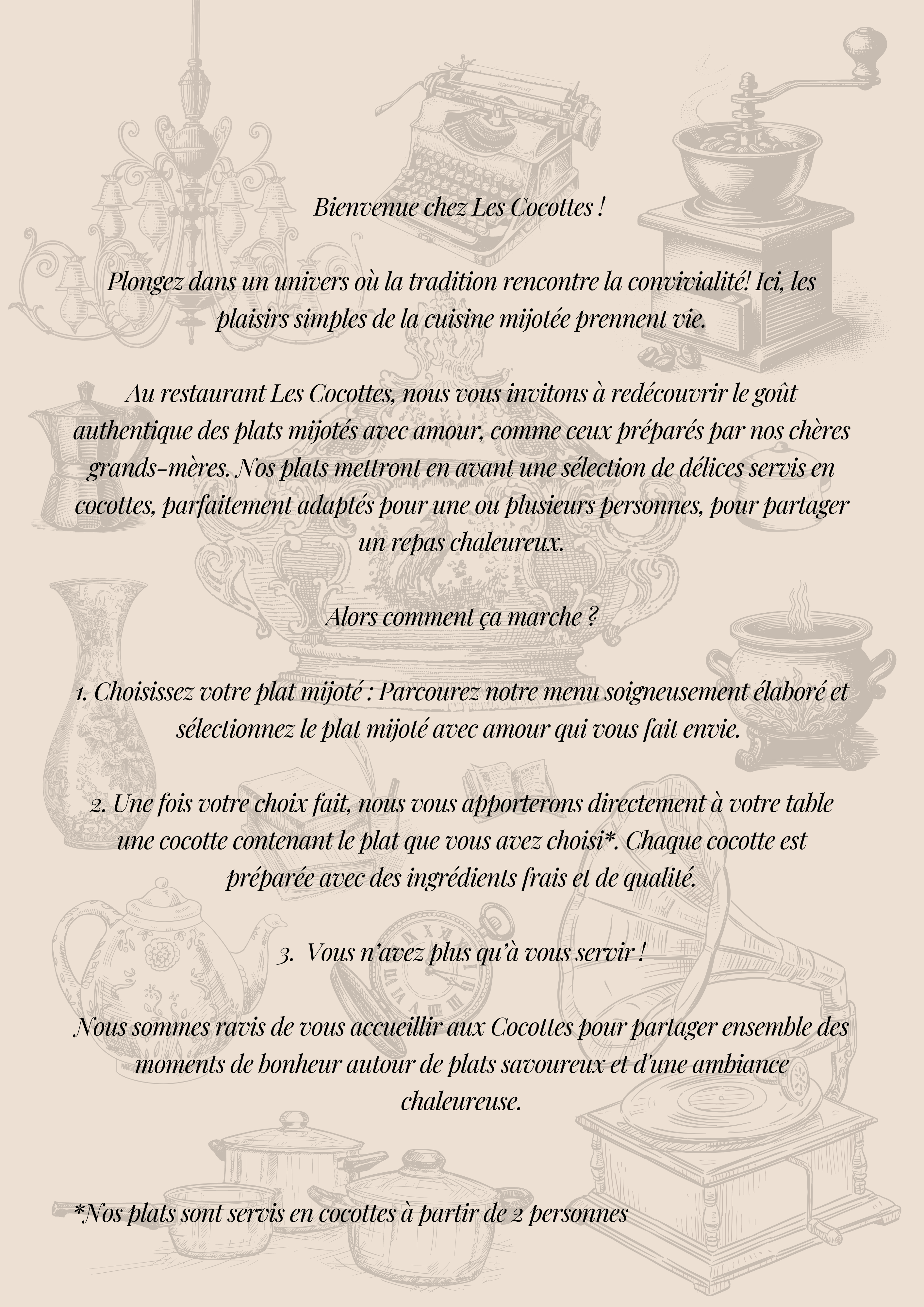 Entre nappes à carreaux et touches rustiques, notre restaurant traditionnel propose une cuisine mijotée, servie en cocottes, à base de produits frais et français. Ambiance vintage d’antan.